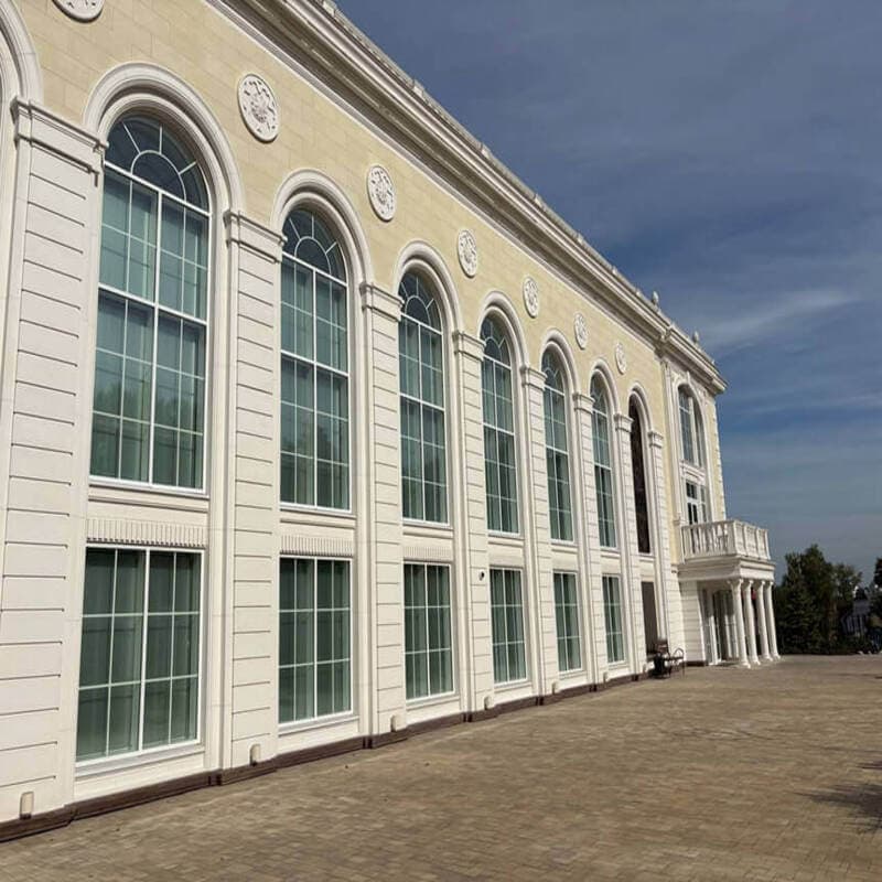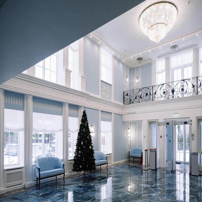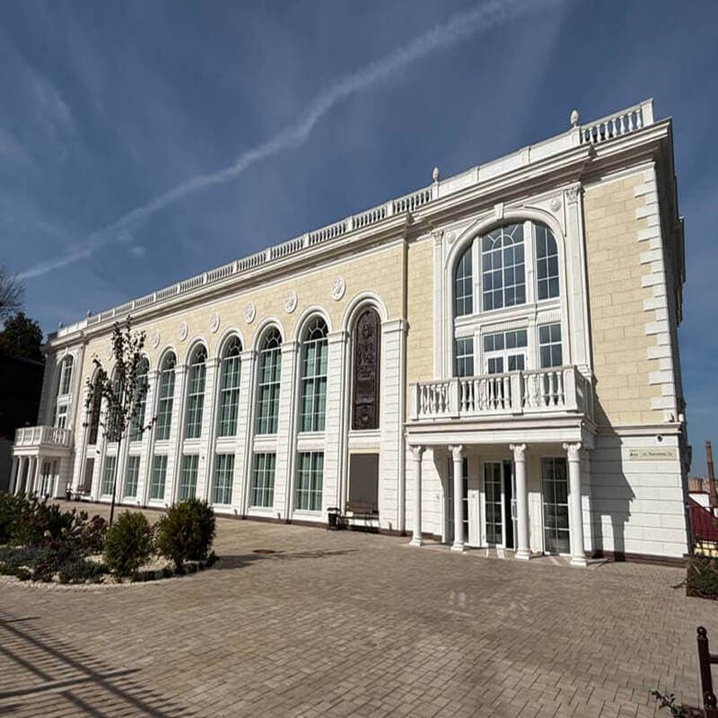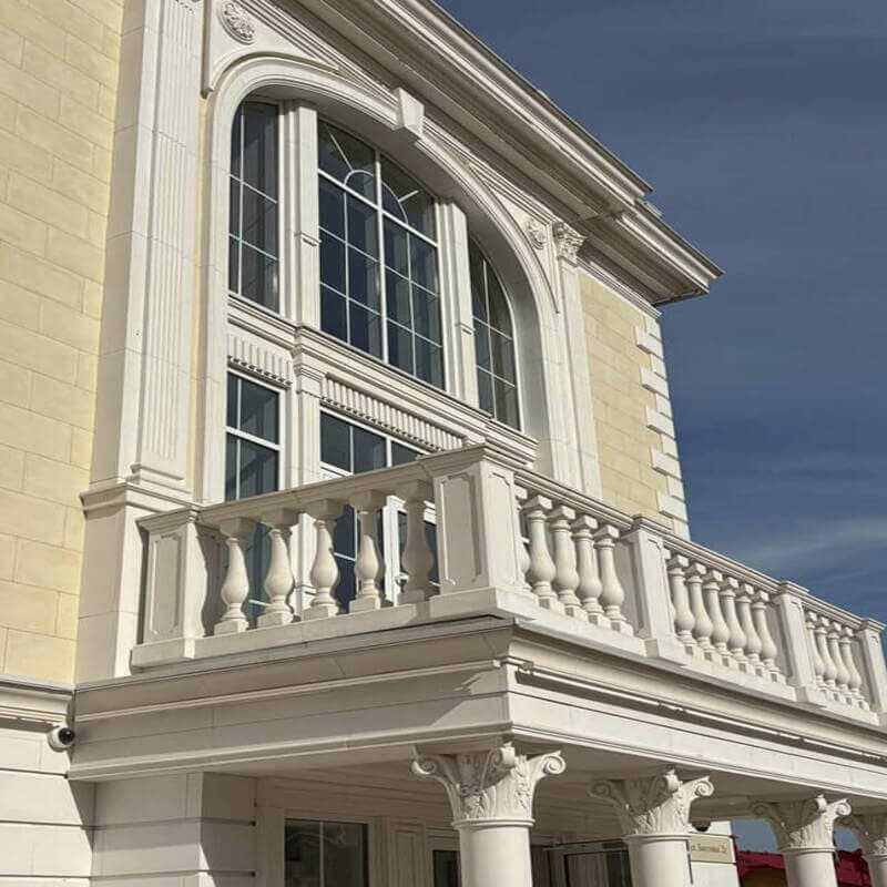 Здание выполнено в неоклассическом стиле и спроектировано так, чтобы гармонировать с историческим центром города: натуральные материалы, лепнина, колонны.